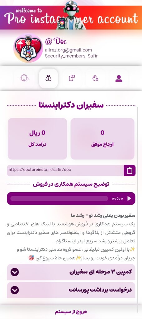 در تب سفیران به پنل بازاریابی پیشرفته دکتراینستا دسترسی پیدا میکنید که در آن، عملکرد شما بهصورت شفاف و لحظهای نمایش داده میشود؛ از جمله درآمد کل، تعداد ارجاعات موفق، و جزئیات فعالیتهای انجامشده از طریق لینک اختصاصیشما.